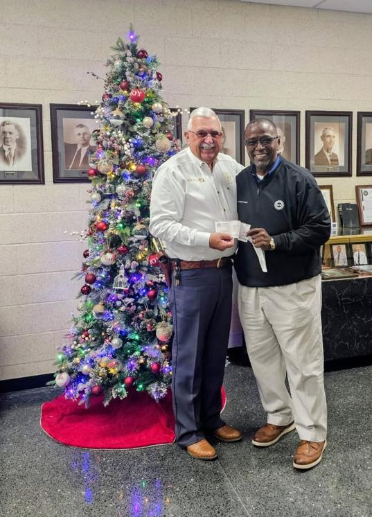 President / Shop Chair Ricky McDowell presents a donation to Lincoln County Sherrif Bill Beam for food baskets.