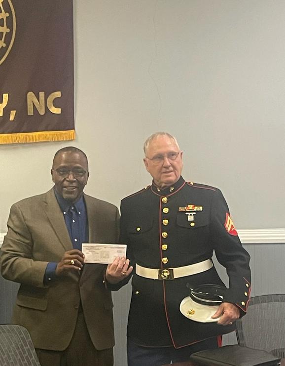 President/Shop Chair Ricky McDowell presents a donation to Corporal Glen Perkins for the Toys for Tots.